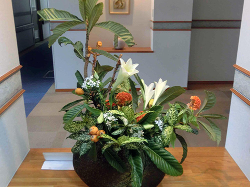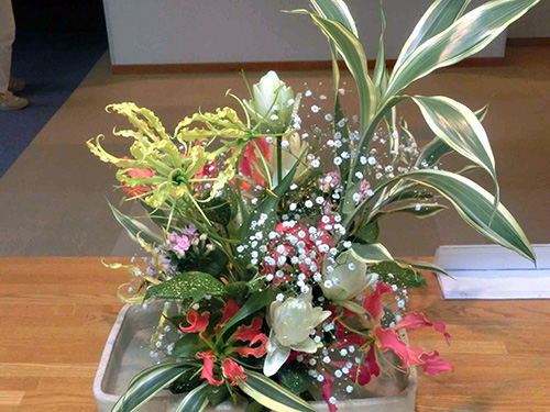 | H26.06.03 | 【今週の光風流】 ドラセナサンデリアナ、ドラセナゴットの緑の中に、ノーブルリリー、グロリオサ、かすみ草、ブバルティアが色とりどりで心を和ませてくれます。 |
