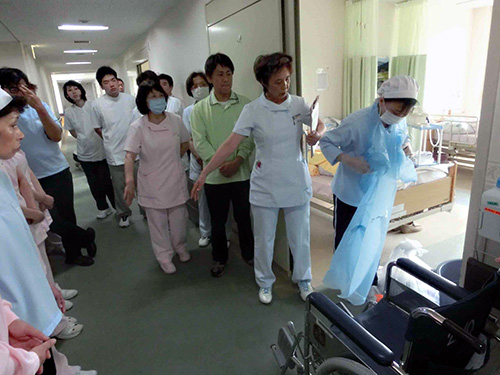 | H26.06.04 | 【お知らせ】 院内感染対策研修を開催しました。ノロウイルス嘔吐物処理の方法、感染性廃棄物の持ち出し方をシュミレーション形式で行いました。 これからも季節に関係なく日常より感染対策に取り組んでいきたいです。 |