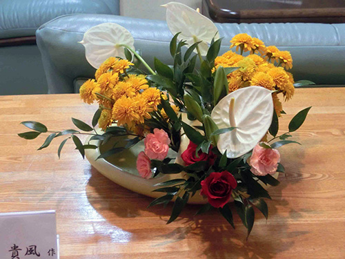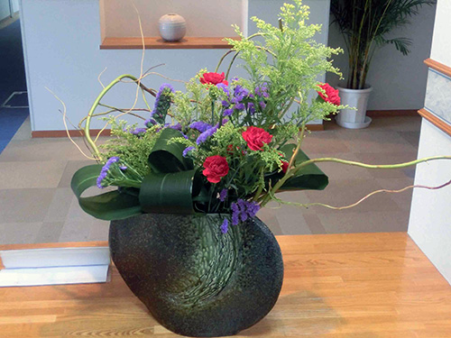 【今週の光風流】 色とりどりの花にフトイをアレンジすることで鯉のぼりを想像させる生け花になっています。玄関には5月人形も飾っていますので是非ご鑑賞ください。 |