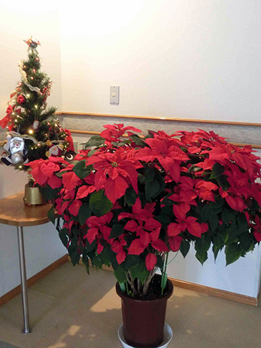 | H26.12.01 | 【お知らせ】 残すところ今年も1か月になりました。庭には葉牡丹、玄関にはポインセチア、クリスマスツリーと模様替えをしました。 ポインセチアは6ヶ月かけて石丸常務が育てました。 |
