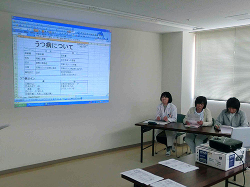 | H26.12.24 | 【医療安全研修会】 医療安全研修会を開催しました。医療安全に関するシンポジウムに参加しての伝達研修でインシデント報告の意義について学習しました。米田薬剤師からは、薬の服用でのふらつきが転倒・骨折の危険を招くという話をしてもらい、医療安全の意識の向上が出来ました。今後も病院全体で医療安全に取り組んでいきます。 |