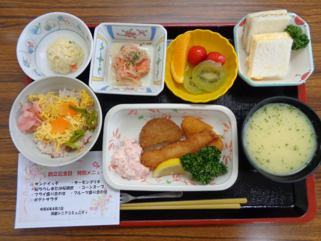 創立記念日 2022.04.01 令和4年4月1日、本日は須磨シニアコミュニティ創立記念日です。 新しい職員も採用され、永年勤続表彰もあり、ご馳走も出ました。エビのタルタルソースも桜色でした。 施設の近くは桜も見ごろになっております。外は強風で散らなければいいのですが・・・。明日が見ごろのようですよ。