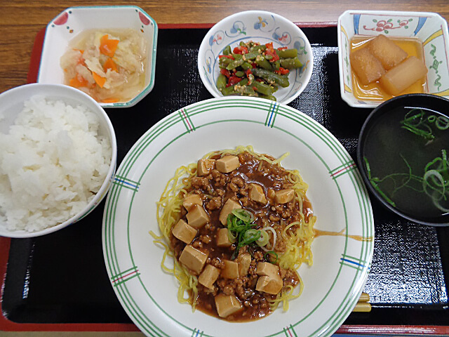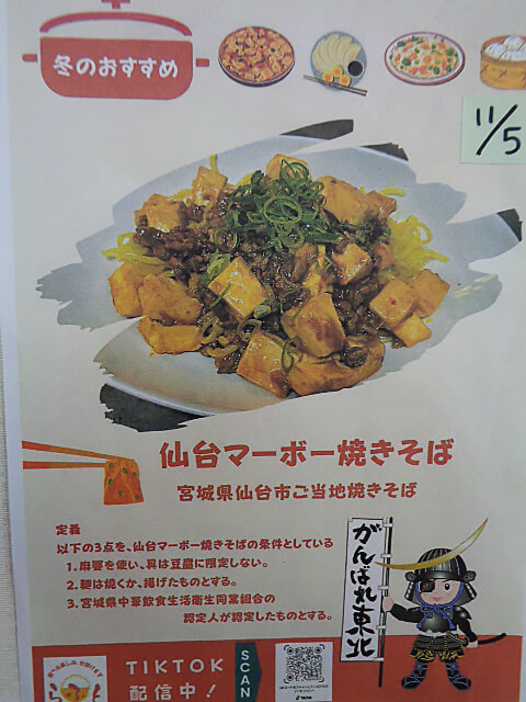 R6.11.5本日は仙台麻婆焼きそばです。仙台と言えば牛タンですが、これもお勧めとのこと。 まぜそばに近いイメージでした。感想は月末の栄養会議にて。。。