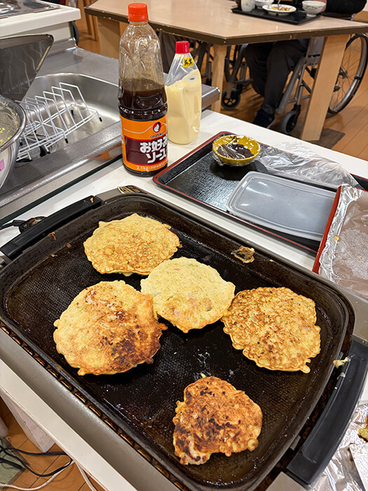 お好み焼きパーティー 2026.03.23 R8.3.17 2階須磨の浦ユニットにてお好み焼きパーティーを開催しました。 このユニットには元々お好み焼きをされていたご利用者様が居られます。 昔を思い出してもらい喜んでおられました。 他のご利用者の方も、美味しく食べておられました。 「お好み焼きの具は?」そうですよね・・・「豚!」です。 皆さんはどんな具がお好みでしょうか?