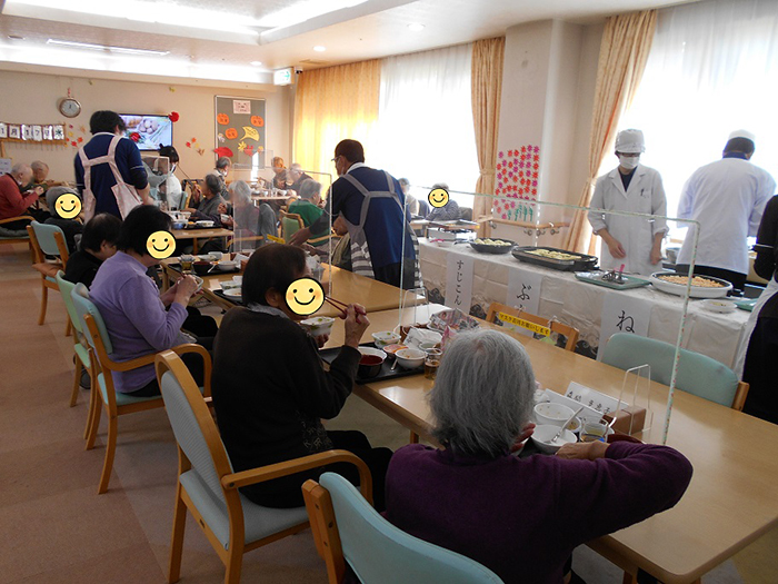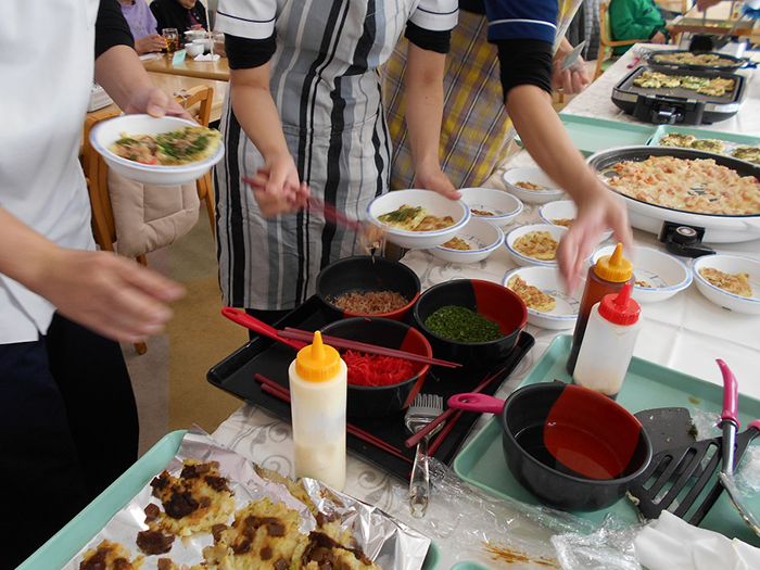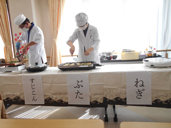 お好み焼きパーティー ~デイサービス~ 2021.11.22 11月20日にデイサービスで、昼食にお好み焼きを提供させて頂きました! 利用者様の前で調理師が焼き、出来立てを召し上がって頂きました♪ お味は、ぶた・ネギ・すじこん・エビマヨチーズの4種類でした。 普段とはまた違った味もあり、皆様沢山おかわりをされ、大好評でした。 中には全種類を食べられた方もおられました。 ご協力いただいた厨房の皆様ありがとうございました。