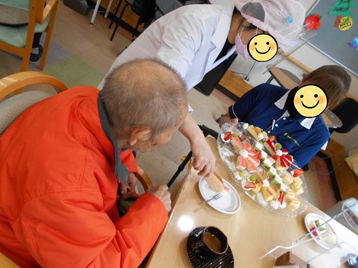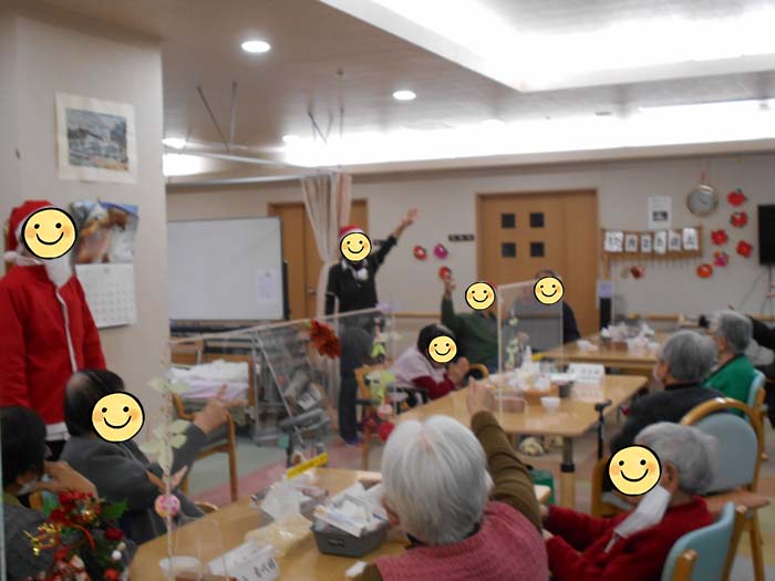 クリスマス会開催 2021.12.28 先日デイサービス内でクリスマス会を行いました。 おやつの時間はケーキバイキング。 豪華に飾りつけられたケーキにご利用者様も感動されていました。 その後はクリスマス限定のゲームやちょっとした物ですがプレゼントもお渡しさせて頂きました。 スタッフもサンタの衣装を着て盛り上げていきました! 季節限定のイベントはスタッフもいつも以上の意気込みです♪ ご協力いただいた厨房の皆様ありがとうございました。