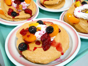 焼いたメレンゲに生クリームを挟んでフルーツを乗せてできあがり!想像していたより大きかったため、歓声があがっていました。