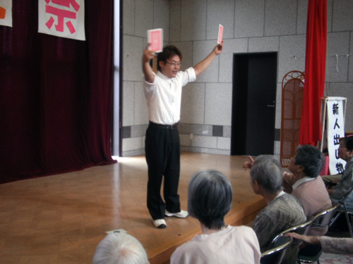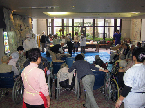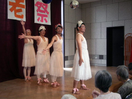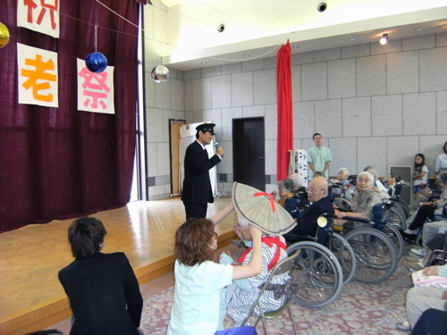 | H24.09.18 | 【お知らせ】 9/16(日) 敬老祭を開催しました。この日は10:00から午前の部、14:00から午後の部に分けて、15:00のお開きになるまで、新入職員の出し物(パントマイム・花さかじいさんの劇)あり、キモかわいい(?)男性職員による白鳥の湖のバレエあり、歌謡ショー等々を行いました。この日の為に職員一同練習に励んだ甲斐があり、入所者様、ご家族様にとても喜んでいただき、笑顔がたくさん咲きました。そして、入所者様がモデル参加のファッションショーではとてもお元気な姿が印象的でした。来年も益々お元気でモデルさん、よろしくお願いしますネ。ご家族様ご協力のもと、家族会も開かせていただき、施設で取り組んでいる自立支援のご説明や感染症対策についてなどお話させていただきました。また、中川宝塚市長が入所者様100歳のお祝いに来所されました。 |