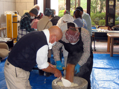 | 毎年恒例のもちつきが行われました。 地元の民生委員の方々に手伝っていただき、立派なお餅ができあがりました。 利用者様には、できたてのお餅を食べやすいサイズに切り、ぜんざいを召し上がっていただきました。 またお餅を食べることが難しい方には葛餅を召し上がってもらっています。 |