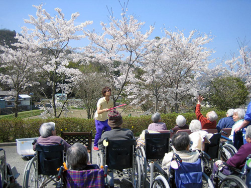 | 西谷地域では、市街地から一足遅れて今が桜満開の時期です。施設の玄関前でお花見し、シャボン玉を楽しみました。利用者様からは「きれいな桜や」「暖かくて気持ちいい」との声が聞かれ、楽しいひと時となりました。 | ![]() ![]() |