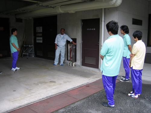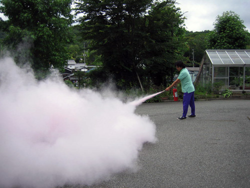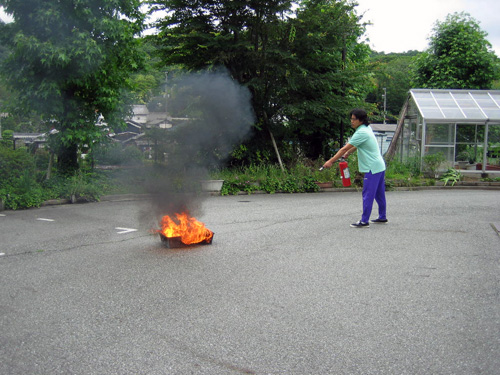 | H24.06.22 | 【お知らせ】 平成24年度第1回目の避難訓練を実施いたしました。今回の出火想定場所は1階東食堂、出火想定原因はコンセントからの漏電です。「利用者様を避難場所まで誘導→人数確認→隊長への報告」という流れを約5分で完了しました。 ただ実際の火災はいつ起きるか予測できません。訓練のようにスムーズに避難することは難しいでしょう。だからこそ訓練を継続して実施し、体に覚えさせることが大切です。 避難訓練終了後は消火訓練を実施し、燃えたぎる炎を職員が見事に消火しました。 |