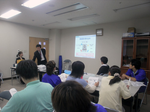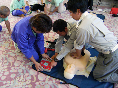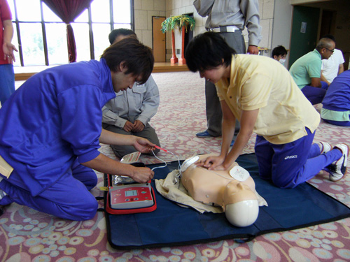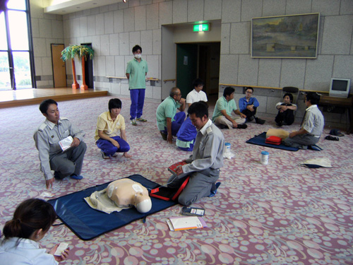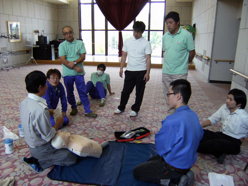 | H24.10.25 | 【お知らせ】 宝塚シニアコミュニティでは、毎年心肺蘇生法AED講習を行っております。今年も10/19(金)に宝塚西消防署にご協力頂き、職員向け心肺蘇生法AED講習を開催しました。 まずは宝塚西消防署の方にお手本を見せていただいた後、人形を使用しながら個人ごとに実践に近い練習をしました。 高齢者施設では人の命に関わることがいつ起こってもおかしくありません。そんな時は、看護師を中心に対応いたしますが、必ずしも看護師がいるとは限りません。すべての職員がいつでも行動を起こせる、知識・経験・勇気を身につけて、万が一の時に備えておく必要があります。 宝塚西消防署の方々にはお忙しい中、貴重なお時間を頂き感謝申し上げます。ありがとうございました。 |